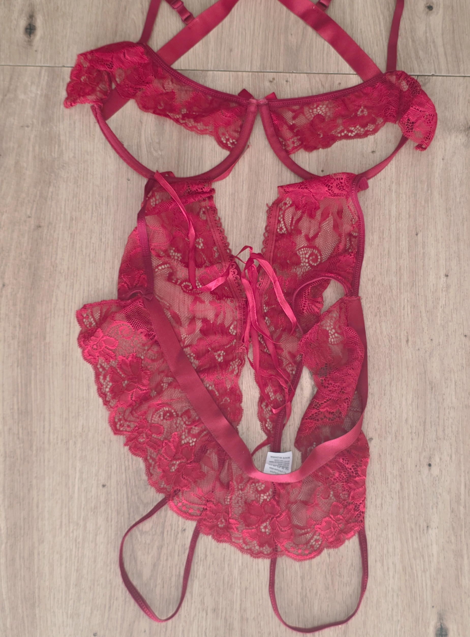 Body rouge ouvert taille L, doux et ajusté, se transforme en trésor fetish selon vos envies : optez pour une livraison immédiate ou une version ultra-personnalisée selon vos fantasmes les plus intimes. Imaginez son parfum  capturé rien que pour vous, prêt à enflammer vos sens ; ajoutez des vidéos sur mesure et explorez d’autres options coquines pour une expérience inoubliable, avec tarif variable en fonction des personnalisations choisies.​