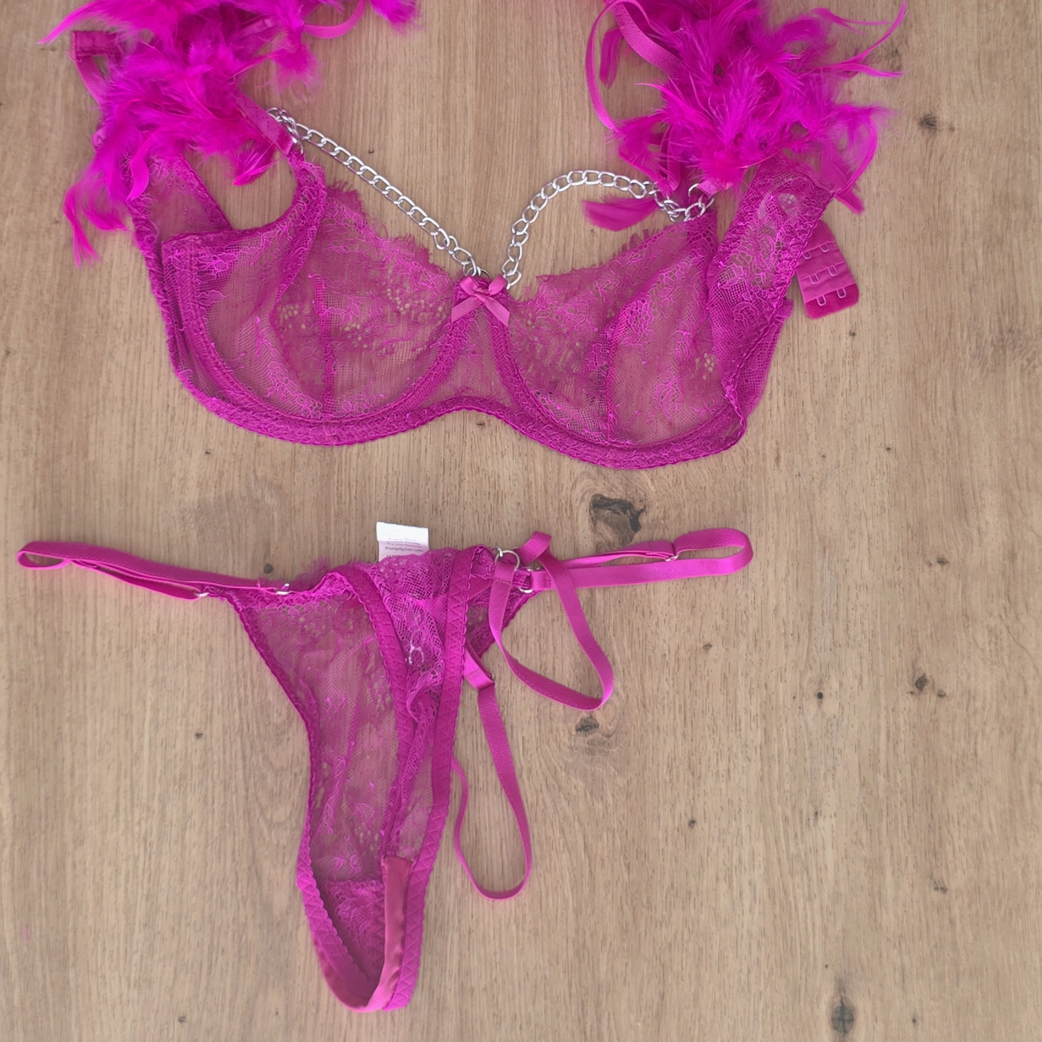 Ensemble lingerie rose transparent avec plumes avec porte jarretelle taille M, doux et ajusté, se transforme en trésor fetish selon vos envies : optez pour une livraison immédiate ou une version ultra-personnalisée selon vos fantasmes les plus intimes. Imaginez son parfum  capturé rien que pour vous, prêt à enflammer vos sens ; ajoutez des vidéos sur mesure et explorez d’autres options coquines pour une expérience inoubliable, avec tarif variable en fonction des personnalisations choisies.​
